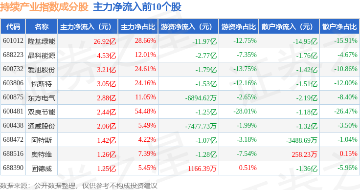 资金流向方面,持续产业(000114)指数成份股当日主力资金净流入合计6.54亿元,游资资金净流出合计7.71亿元,散户资金净流入合计1.17亿元。成份股资金流向详情见下表: