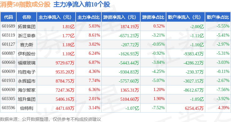 资金流向方面,消费50(000126)指数成份股当日主力资金净流出合计9.82亿元,游资资金净流入合计6.25亿元,散户资金净流入合计3.57亿元。成份股资金流向详情见下表: