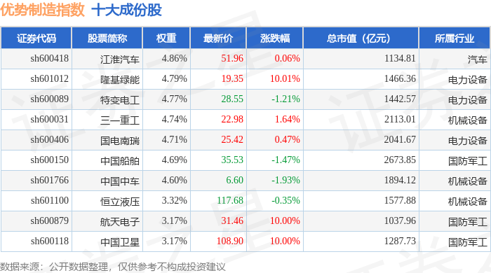 证券之星消息,1月23日,优势制造(000146)指数报收于8959.81点,涨2.46%,成交1567.94亿元,换手率3.91%。当日该指数成份股中,上涨的有37家,晶科能源以20.0%的涨幅领涨,下跌的有13家,五洲新春以4.07%的跌幅领跌。
