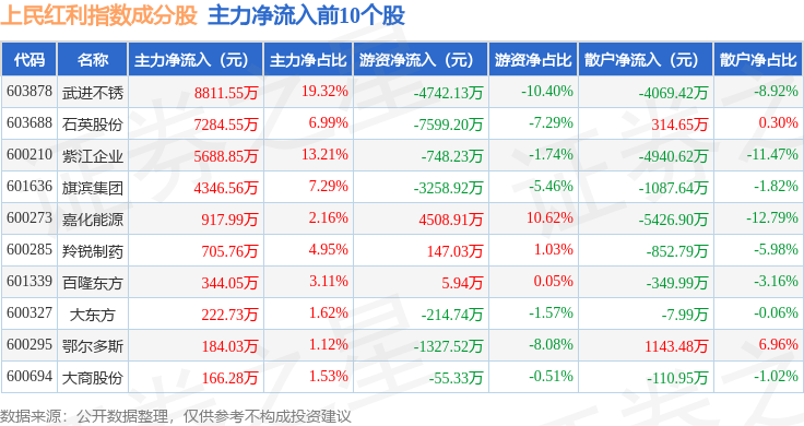 资金流向方面,上民红利(000153)指数成份股当日主力资金净流出合计3025.0万元,游资资金净流出合计6210.36万元,散户资金净流入合计9235.36万元。成份股资金流向详情见下表: