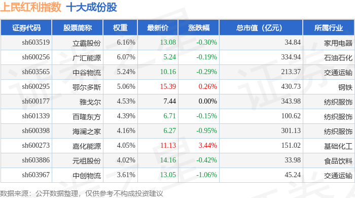 上民红利(000153)指数十大成份股详情如下: