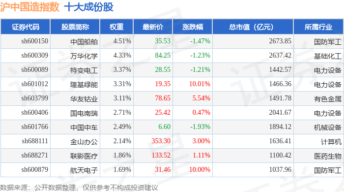 沪中国造(000161)指数十大成份股详情如下: