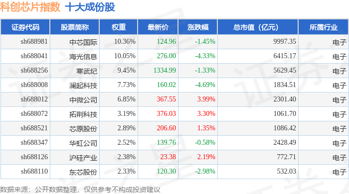 科创芯片(000685)指数十大成份股详情如下: