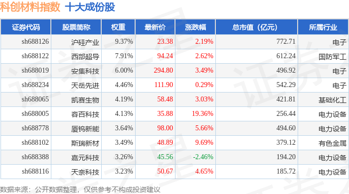 科创材料(000689)指数十大成份股详情如下: