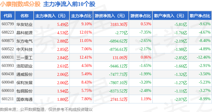 资金流向方面,小康指数(000901)成份股当日主力资金净流出合计59.08亿元,游资资金净流入合计63.03亿元,散户资金净流出合计3.95亿元。成份股资金流向详情见下表: