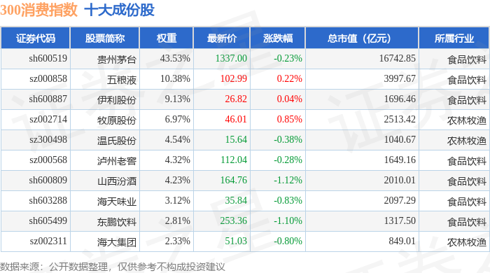 证券之星消息,1月23日,300消费(000912)指数报收于19924.95点,跌0.23%,成交223.69亿元,换手率0.84%。当日该指数成份股中,上涨的有4家,牧原股份以0.85%的涨幅领涨,下跌的有13家,洋河股份以1.53%的跌幅领跌。