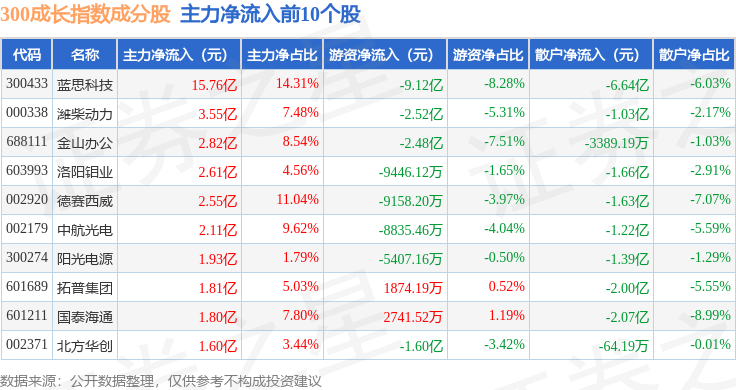 资金流向方面,300成长(000918)指数成份股当日主力资金净流出合计149.18亿元,游资资金净流入合计51.75亿元,散户资金净流入合计97.43亿元。成份股资金流向详情见下表: