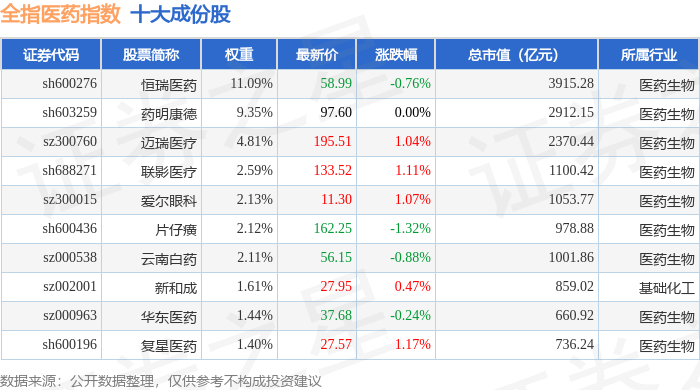 全指医药(000991)指数十大成份股详情如下: