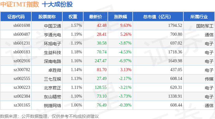 中证TMT(000998)指数十大成份股详情如下: