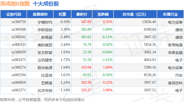 证券之星消息,1月23日,深成指R(399002)指数报收于19392.14点,涨0.81%,成交9256.62亿元,换手率2.83%。当日该指数成份股中,上涨的有357家,迈为股份以20.0%的涨幅领涨,下跌的有124家,深南电路以6.97%的跌幅领跌。