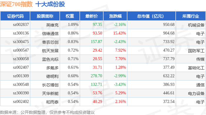 深证700(399010)指数十大成份股详情如下: