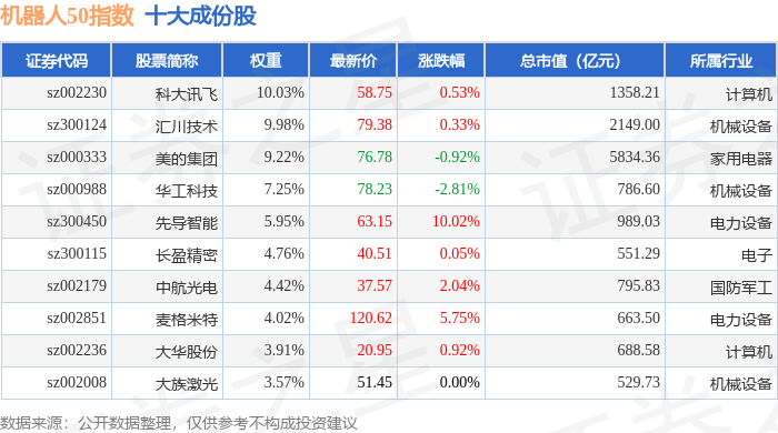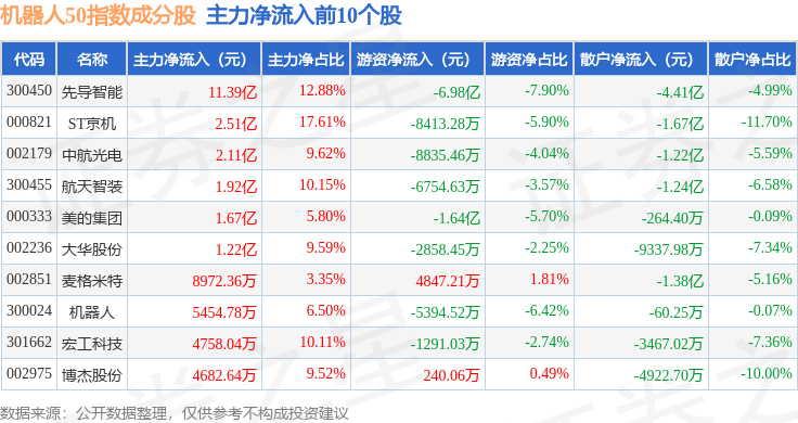 资金流向方面,机器人50(399283)指数成份股当日主力资金净流入合计16.16亿元,游资资金净流出合计16.2亿元,散户资金净流入合计326.79万元。成份股资金流向详情见下表:
