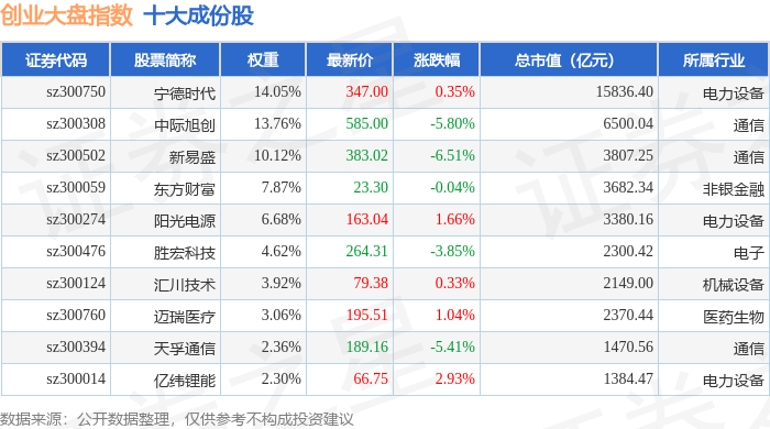 证券之星消息,1月23日,创业大盘(399293)指数报收于6541.04点,跌0.48%,成交1863.16亿元,换手率2.98%。当日该指数成份股中,上涨的有35家,晶盛机电以19.98%的涨幅领涨,下跌的有15家,新易盛以6.51%的跌幅领跌。