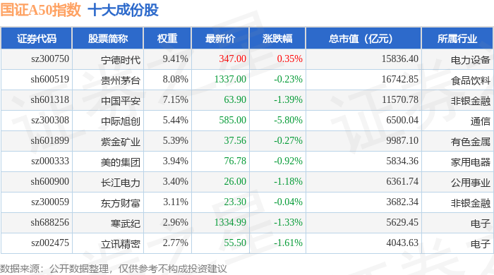 国证A50(399310)指数十大成份股详情如下: