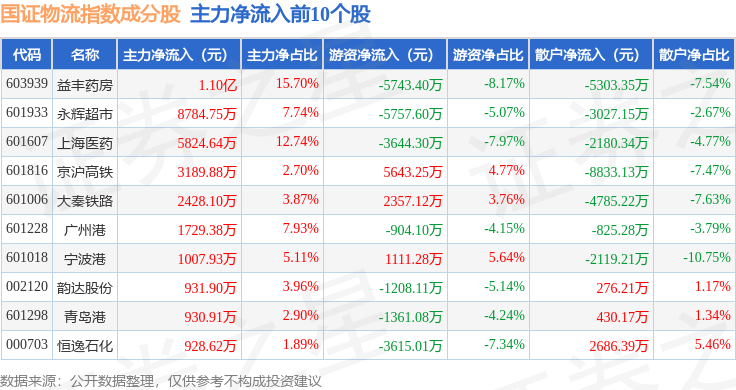 资金流向方面,国证物流(399353)指数成份股当日主力资金净流出合计4.83亿元,游资资金净流入合计1.02亿元,散户资金净流入合计3.82亿元。成份股资金流向详情见下表:
