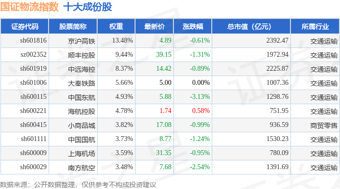证券之星消息,1月23日,国证物流(399353)指数报收于2160.76点,跌0.47%,成交199.8亿元,换手率0.76%。当日该指数成份股中,上涨的有14家,益丰药房以10.02%的涨幅领涨,下跌的有21家,中国东航以3.13%的跌幅领跌。