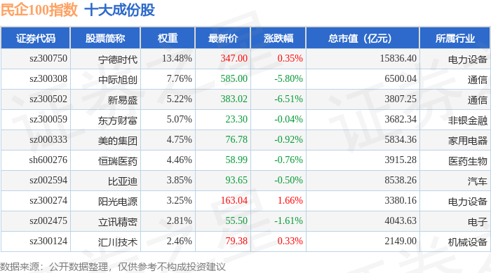 民企100(399362)指数十大成份股详情如下: