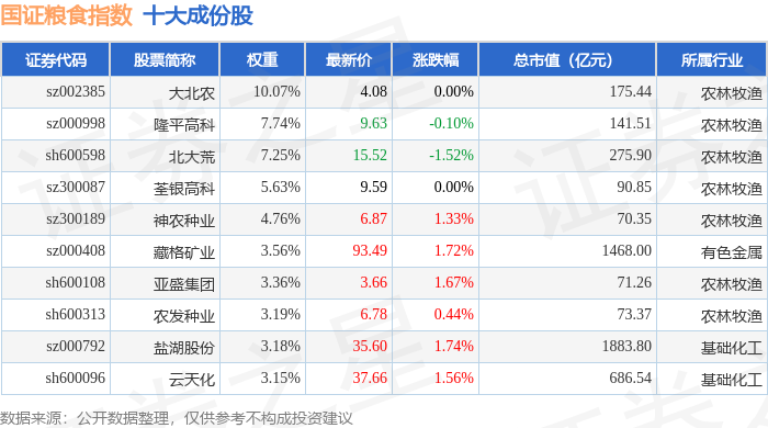 国证粮食(399365)指数十大成份股详情如下:
