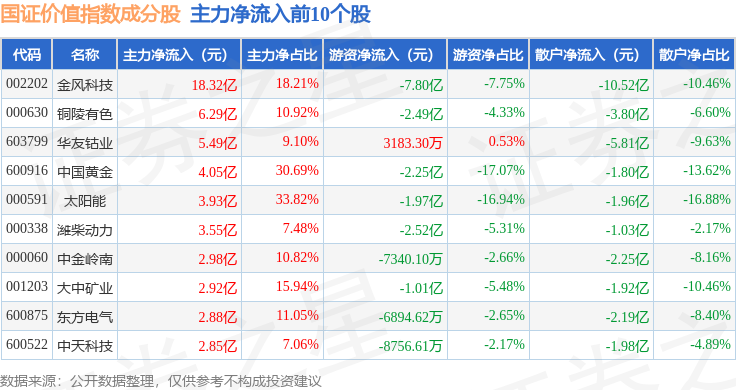 资金流向方面,国证价值(399371)指数成份股当日主力资金净流出合计38.57亿元,游资资金净流入合计2196.06万元,散户资金净流入合计38.35亿元。成份股资金流向详情见下表: