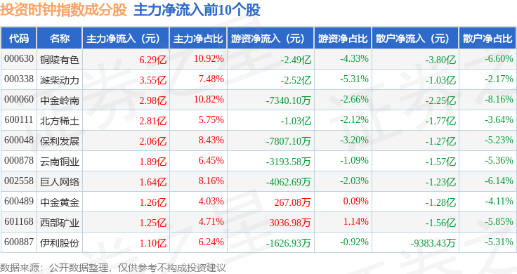 资金流向方面,投资时钟(399391)指数成份股当日主力资金净流出合计47.25亿元,游资资金净流入合计13.31亿元,散户资金净流入合计33.94亿元。成份股资金流向详情见下表:
