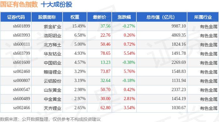 证券之星消息,1月23日,国证有色(399395)指数报收于11505.93点,涨2.5%,成交1412.89亿元,换手率3.48%。当日该指数成份股中,上涨的有43家,华峰铝业以10.0%的涨幅领涨,下跌的有6家,铂科新材以2.99%的跌幅领跌。