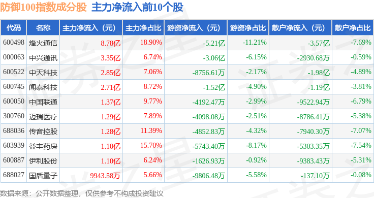 资金流向方面,防御100(399403)指数成份股当日主力资金净流出合计101.01亿元,游资资金净流入合计44.73亿元,散户资金净流入合计56.34亿元。成份股资金流向详情见下表: