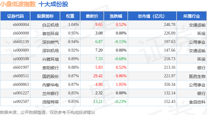 证券之星消息,1月23日,小盘低波(399408)指数报收于16292.21点,涨0.97%,成交573.83亿元,换手率1.76%。当日该指数成份股中,上涨的有99家,太阳能以10.06%的涨幅领涨,下跌的有39家,中国铁物以2.71%的跌幅领跌。