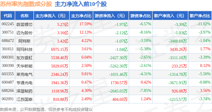 资金流向方面,苏州率先(399410)指数成份股当日主力资金净流出合计23.26亿元,游资资金净流入合计1.4亿元,散户资金净流入合计21.86亿元。成份股资金流向详情见下表: