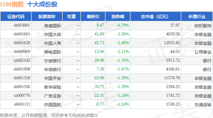 证券之星消息,1月23日,I100(399415)指数报收于8007.26点,涨1.1%,成交1561.78亿元,换手率0.69%。当日该指数成份股中,上涨的有59家,浙江世宝以6.67%的涨幅领涨,下跌的有31家,奥康国际以6.79%的跌幅领跌。