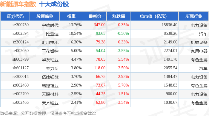新能源车(399417)指数十大成份股详情如下: