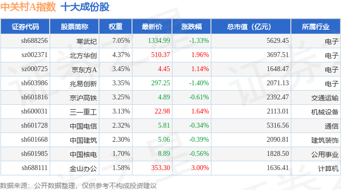 中关村A(399422)指数十大成份股详情如下: