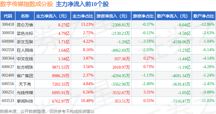 资金流向方面,数字传媒(399434)指数成份股当日主力资金净流出合计11.14亿元,游资资金净流入合计7.84亿元,散户资金净流入合计3.3亿元。成份股资金流向详情见下表: