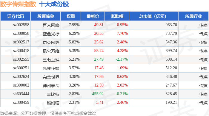 数字传媒(399434)指数十大成份股详情如下: