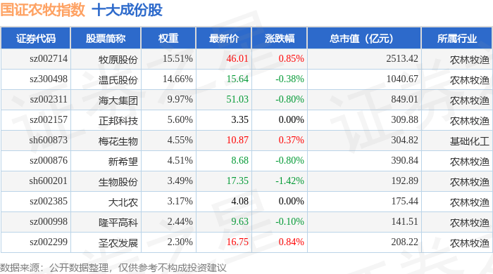 国证农牧(399435)指数十大成份股详情如下: