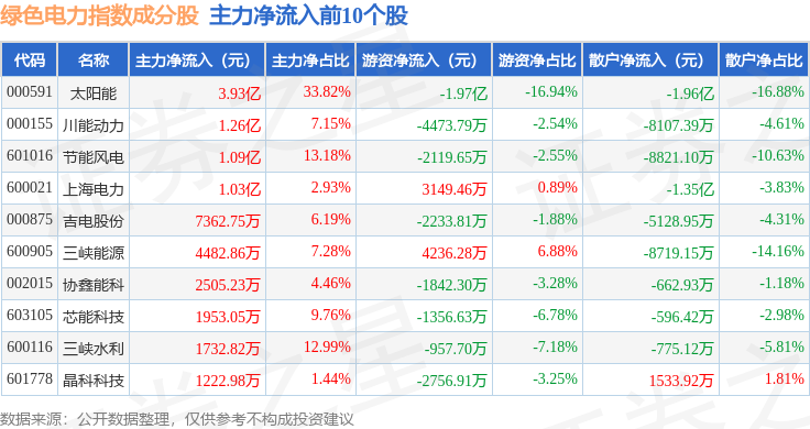 资金流向方面,绿色电力(399438)指数成份股当日主力资金净流出合计20.52亿元,游资资金净流入合计6.0亿元,散户资金净流入合计14.52亿元。成份股资金流向详情见下表: