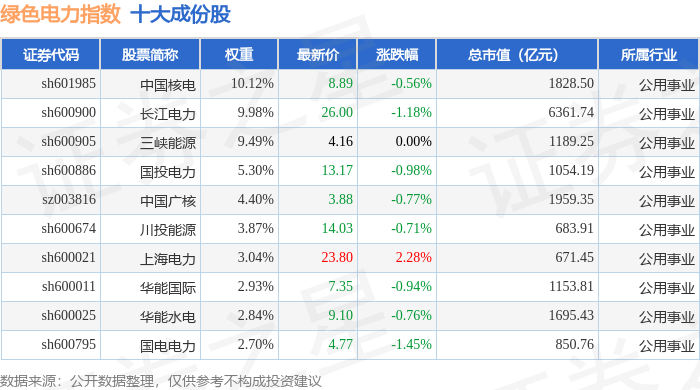 绿色电力(399438)指数十大成份股详情如下: