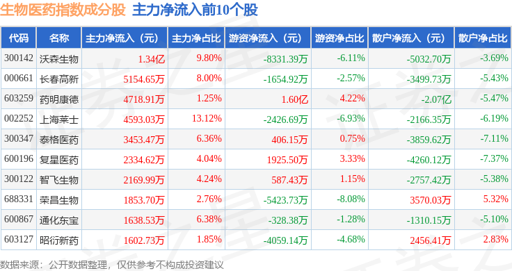 资金流向方面,生物医药(399441)指数成份股当日主力资金净流入合计3.61亿元,游资资金净流出合计8721.67万元,散户资金净流出合计2.74亿元。成份股资金流向详情见下表: