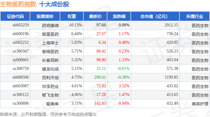 生物医药(399441)指数十大成份股详情如下: