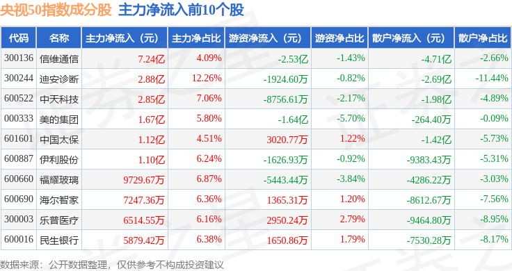 资金流向方面,央视50(399550)指数成份股当日主力资金净流出合计26.59亿元,游资资金净流出合计4.09亿元,散户资金净流入合计30.69亿元。成份股资金流向详情见下表: