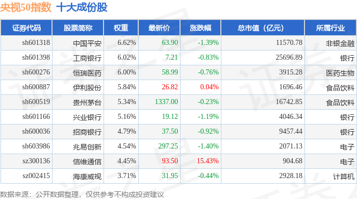央视50(399550)指数十大成份股详情如下:
