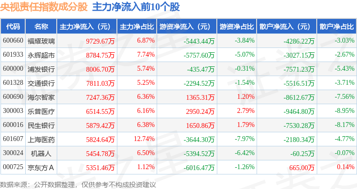 资金流向方面,央视责任(399555)指数成份股当日主力资金净流出合计52.26亿元,游资资金净流入合计10.93亿元,散户资金净流入合计41.33亿元。成份股资金流向详情见下表: