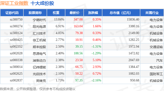 证券之星消息,1月23日,深证工业(399615)指数报收于4526.16点,涨2.45%,成交2440.77亿元,换手率4.22%。当日该指数成份股中,上涨的有127家,迈为股份以20.0%的涨幅领涨,下跌的有33家,鼎泰高科以5.74%的跌幅领跌。