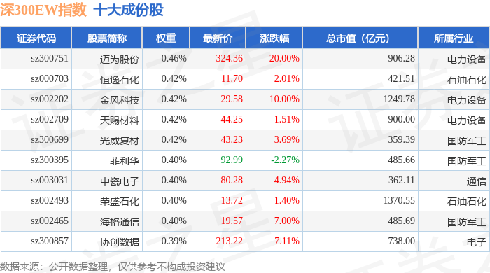证券之星消息,1月23日,深300EW(399633)指数报收于6879.88点,涨1.58%,成交6252.81亿元,换手率2.72%。当日该指数成份股中,上涨的有211家,迈为股份以20.0%的涨幅领涨,下跌的有81家,深南电路以6.97%的跌幅领跌。