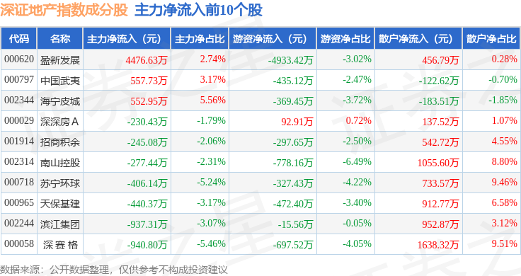 资金流向方面,深证地产(399637)指数成份股当日主力资金净流出合计2.87亿元,游资资金净流出合计486.74万元,散户资金净流入合计2.92亿元。成份股资金流向详情见下表:
