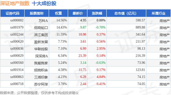 深证地产(399637)指数十大成份股详情如下: