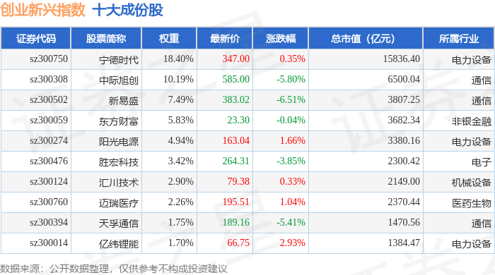 证券之星消息,1月23日,创业新兴(399643)指数报收于4132.22点,涨0.7%,成交3023.38亿元,换手率4.72%。当日该指数成份股中,上涨的有84家,迈为股份以20.0%的涨幅领涨,下跌的有16家,新易盛以6.51%的跌幅领跌。