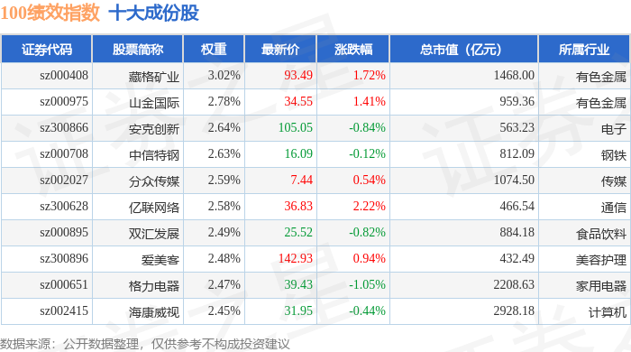 100绩效(399656)指数十大成份股详情如下:
