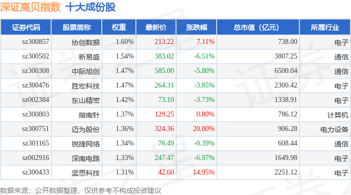 深证高贝(399662)指数十大成份股详情如下: