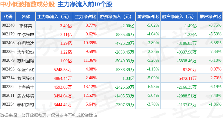 资金流向方面,中小低波(399663)指数成份股当日主力资金净流出合计9.38亿元,游资资金净流出合计8.27亿元,散户资金净流入合计17.65亿元。成份股资金流向详情见下表: