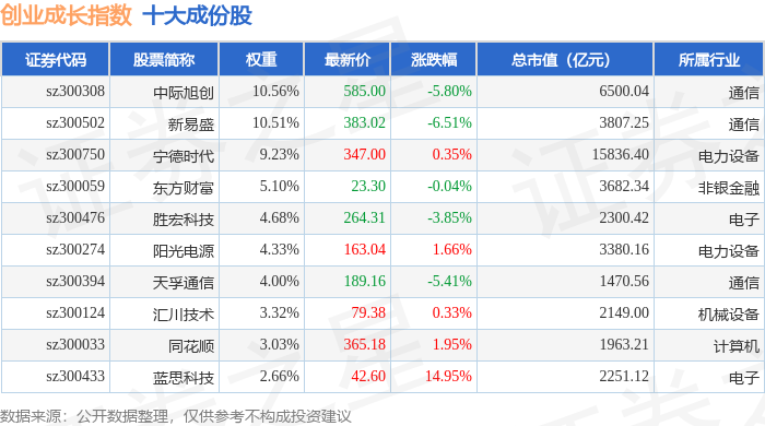 创业成长(399667)指数十大成份股详情如下: